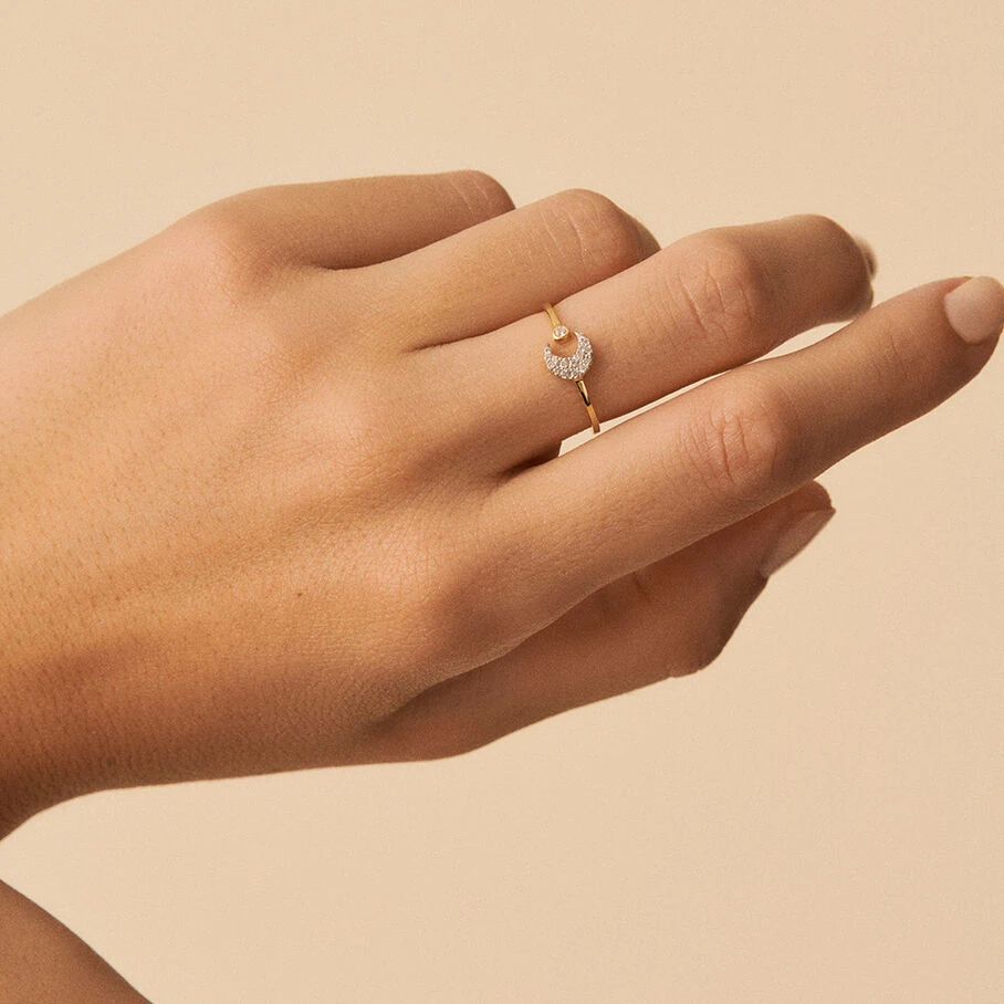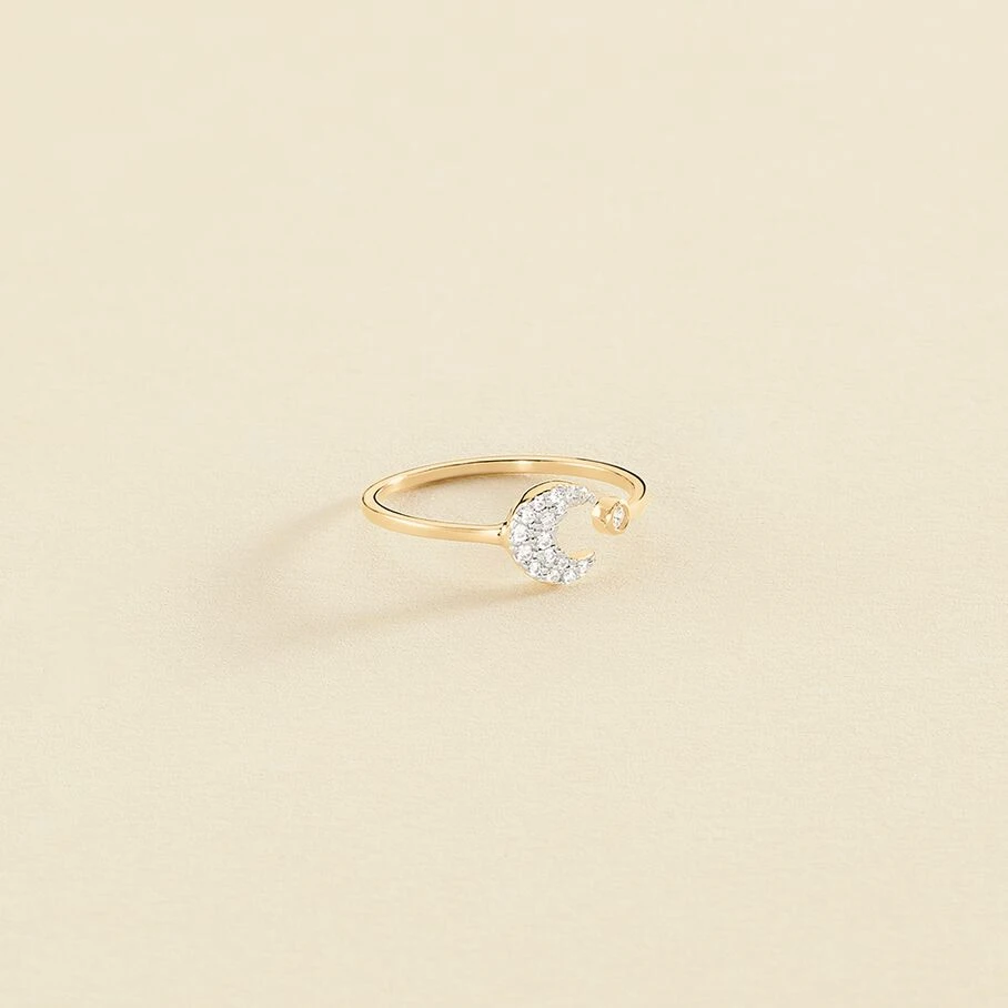 Bague ouverte en toi& moi, en argent véritable et dorée 750/1000, avec une lune pavée et un oxyde de zirconium