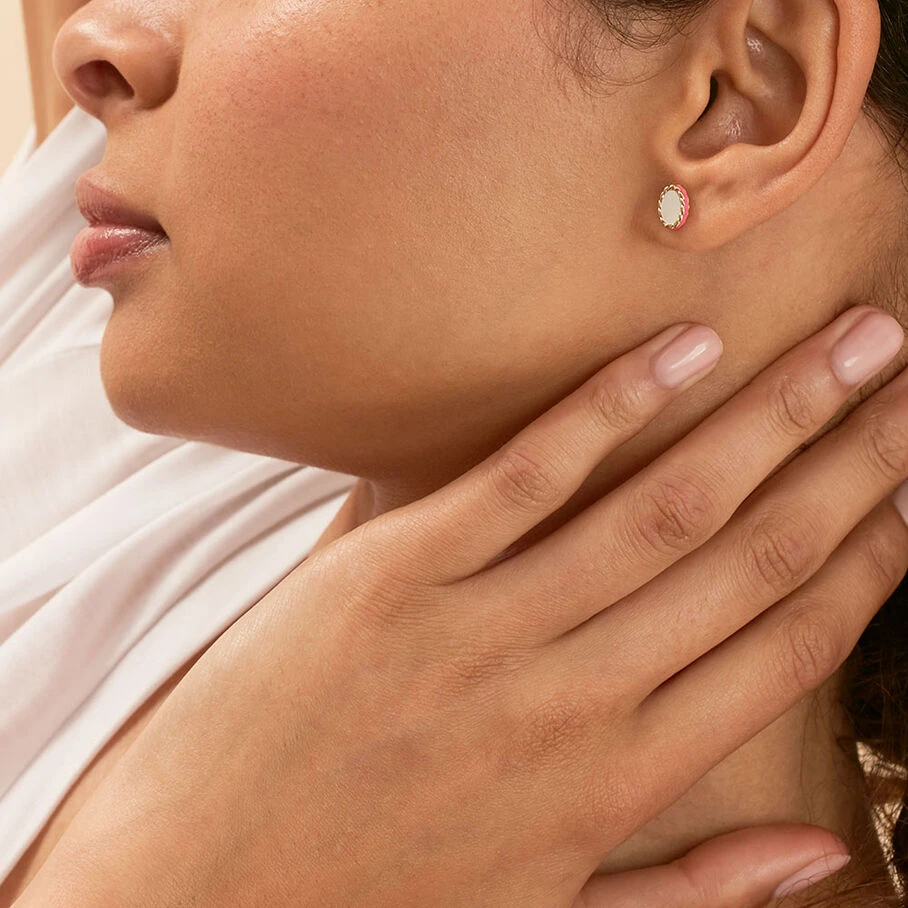 Boucles d’oreilles puces, en argent véritable 925/1000 dorées 750/1000, sertie d’une pierre fine. Un liseré d’émail, sur la tranche de la boucle, apporte une vraie touche d’originalité! Un modèle classique revisité pour affirmer style et personnalité!