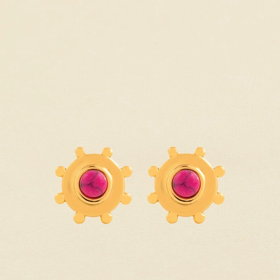 Boucles d’oreilles puces en laiton doré 750/1000, motif ‘soleil’ orné de cabochons de pierres fines