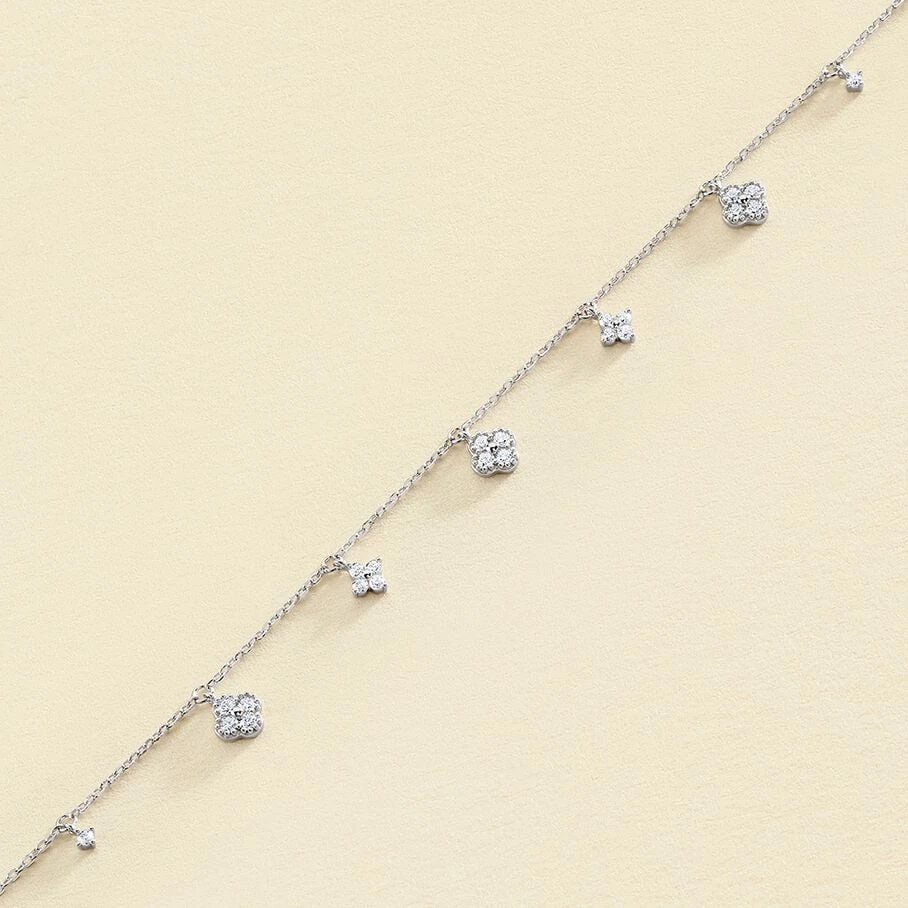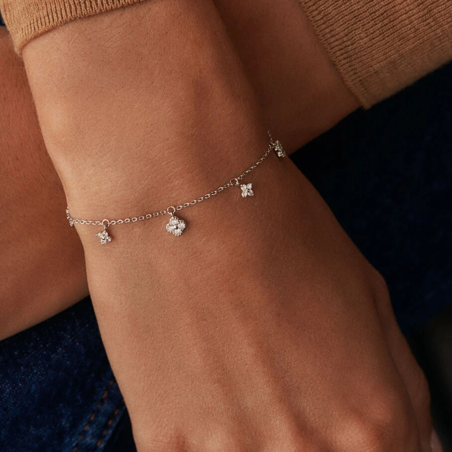 Bracelet chaine, en argent véritable, avec des fleurs d’oxydes de zirconium en pampille et un fin graineti sur le pourtour