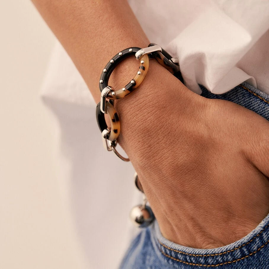 Bracelet en laiton doré 750/1000, avec des maillons ovales en acetate et une boule en métal, fermoir T-bar