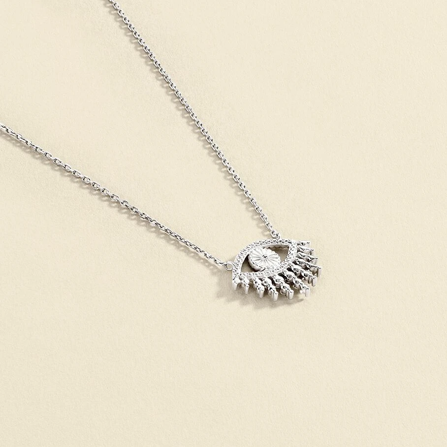 Collier mi-long, en argent véritable 925/1000, dont la fine chaine maille forçat est ornée d’un pendentif en forme d’œil turc. L’iris émaillé et le contour de l’œil serti d’oxydes de zirconium apportent un vrai raffinement et éclat au produit!