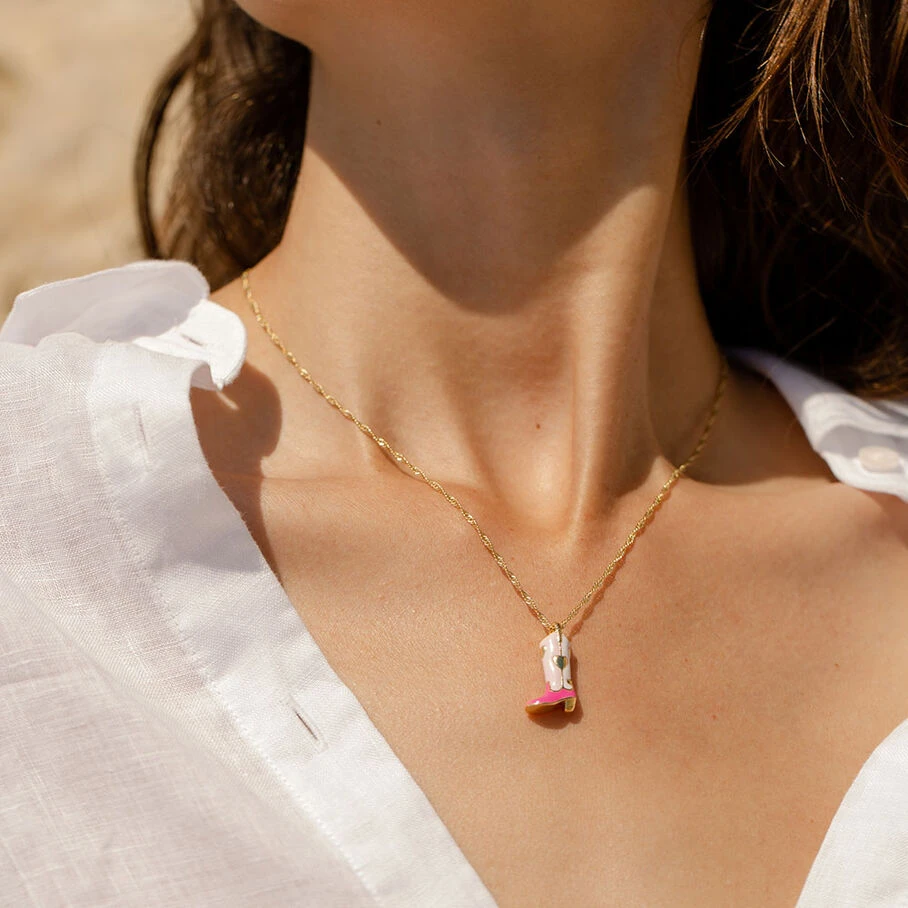 Collier mi-long, en laiton doré 750/1000, botte émaillée sur chaine
