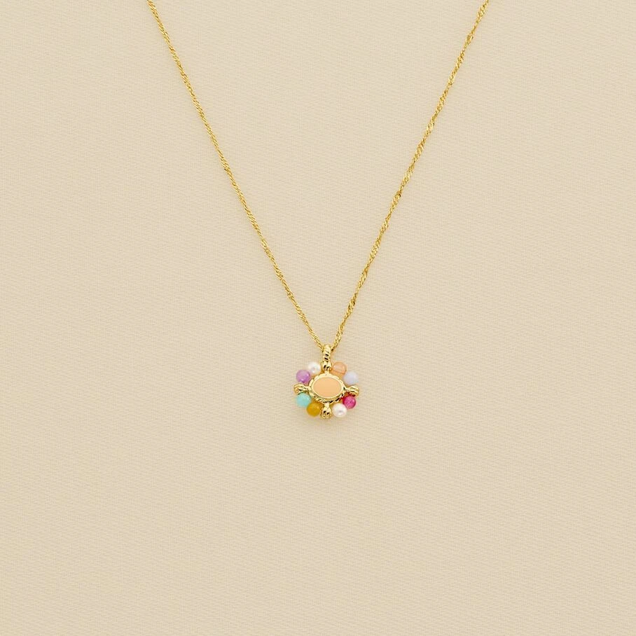Collier court en laiton doré 750/1000, avec une pierre naturelle entournée de minis pierres colorées sur chaîne.