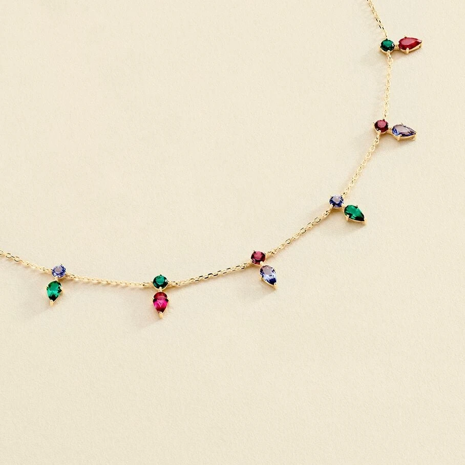 Collier mi-long, en argent véritable doré 750/1000, avec des pampilles d’oxydes de zirconium multicolores, de différentes tailles et formes