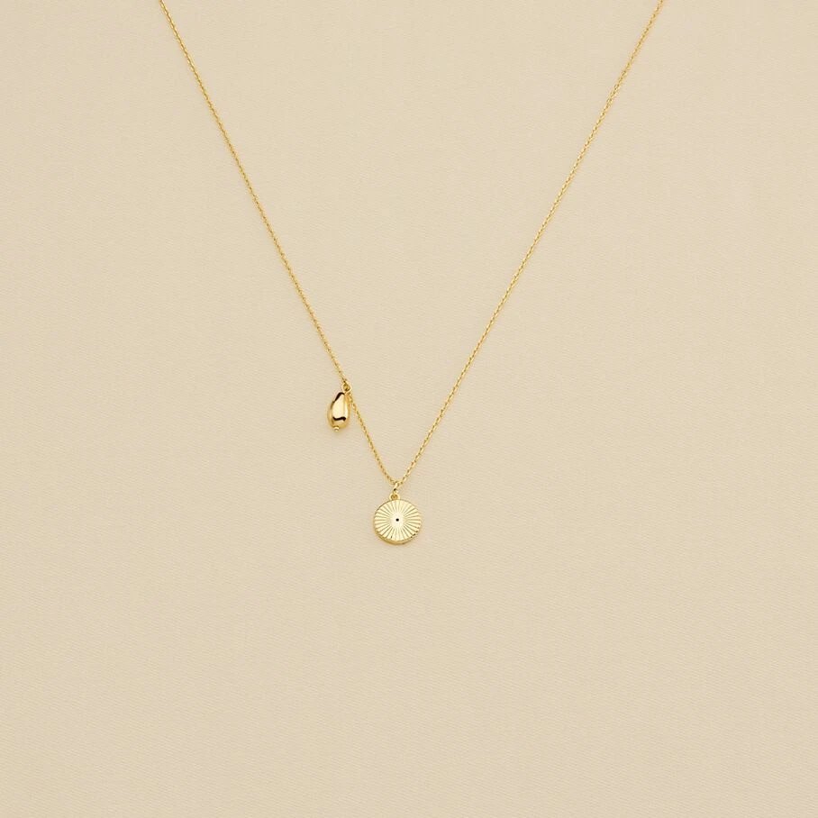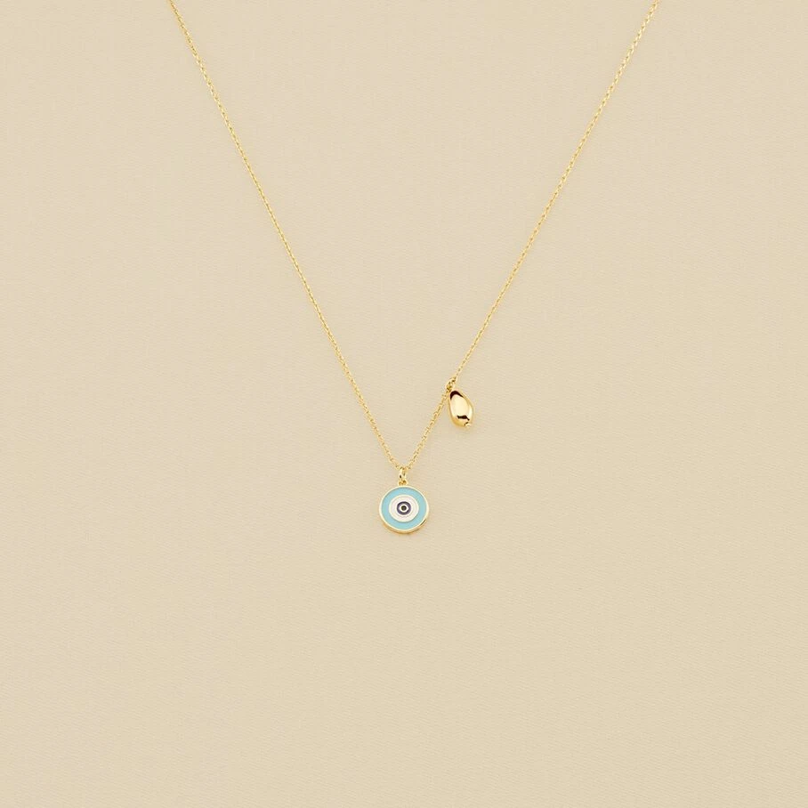 Collier court, en laiton doré à l’or fin, avec un œil turc et un coquillage sur chaine en pendentifs