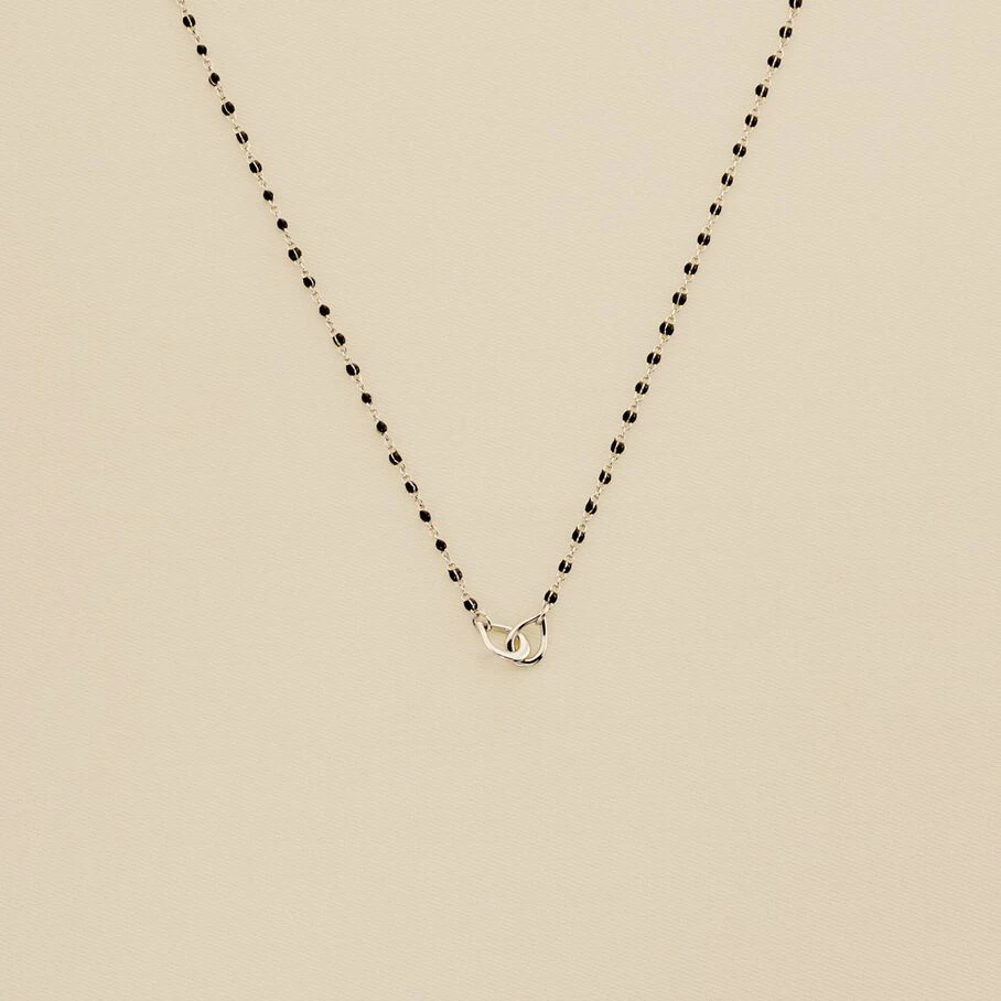 Collier court, laiton, perles d’émail sur chaîne et 2 anneaux gouttes entrelaçés