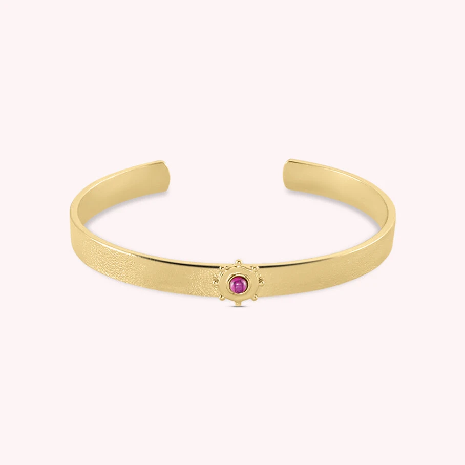 Bracelet jonc ouvert en laiton doré 750/1000 texturé. Il est orné d’un motif soleil et de cabochons de pierres fines au centre et aux extrémités.