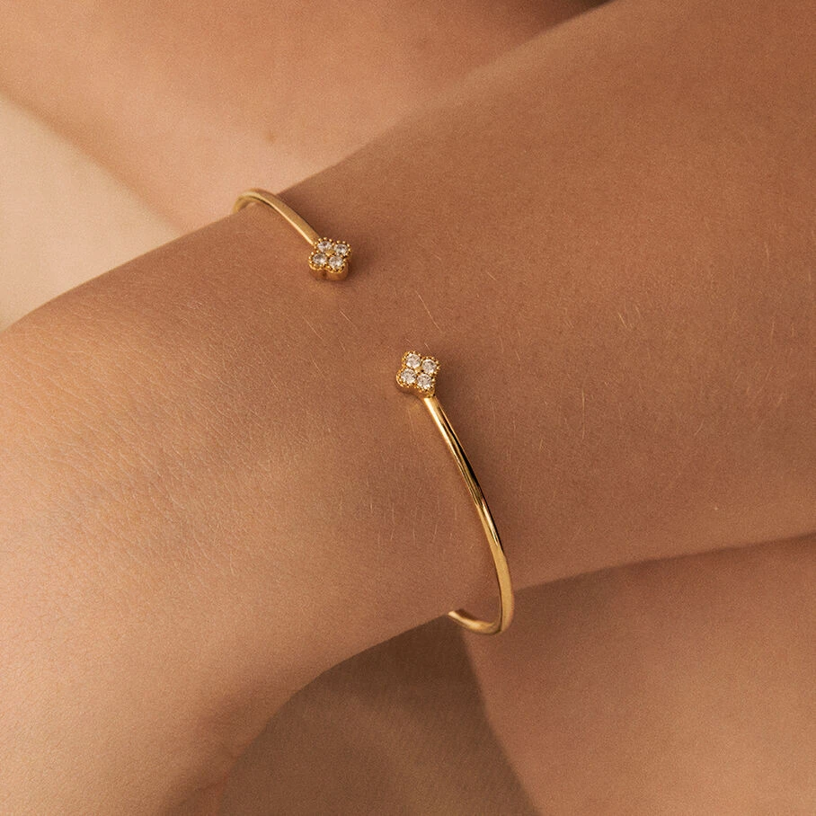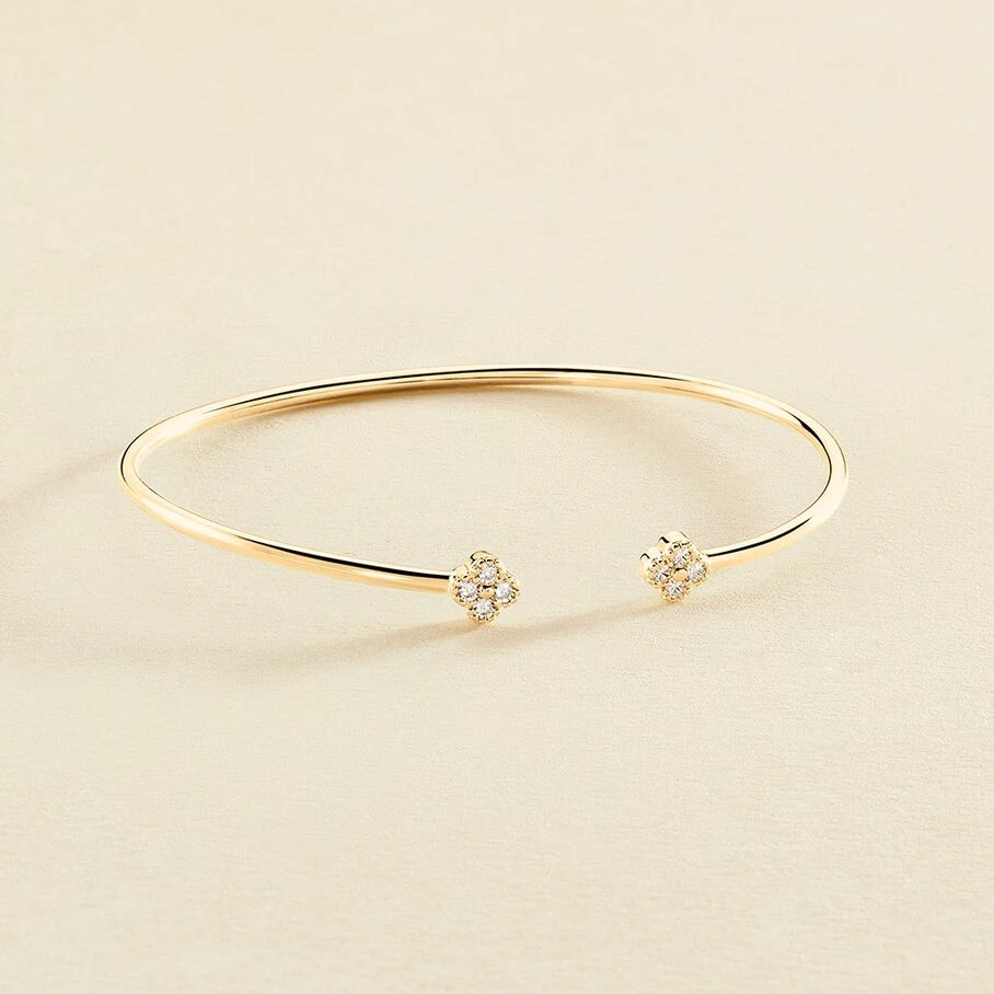Jonc fin ouvert, en argent véritable doré 750/1000, avec des fleurs d’oxydes de zirconium aux extrémités et un fin graineti sur le pourtour