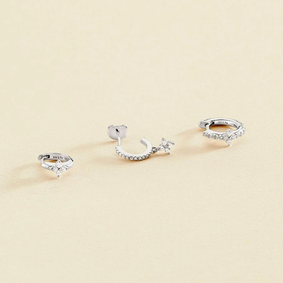Set de 3 boucles d’oreilles créoles, en argent véritable rhodié, dont le motif récurrent est une forme de fleur