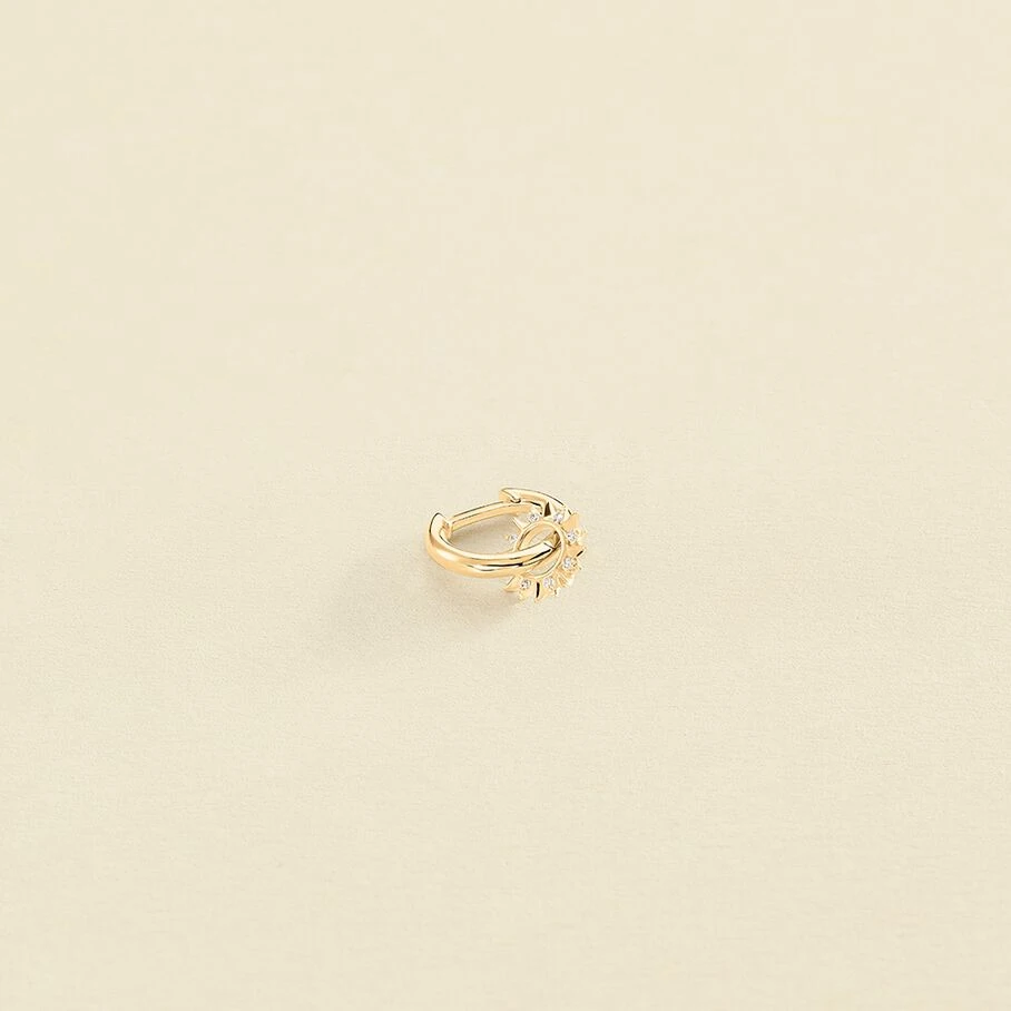 Créole, en argent doré 750/1000, soleil dont certains rayons sont pavés d’oxydes de zirconium. A l’unité pour mieux les mixer et les accumuler.