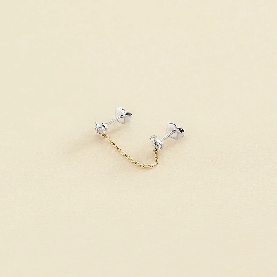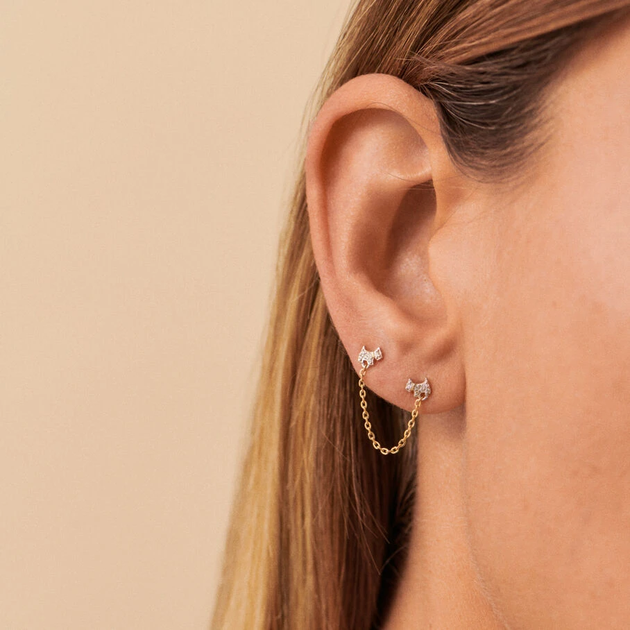 Boucle d’oreille puce, pour oreille doublement perçée, vendue à l’unité, en argent véritable doré 750/1000, ornée de deux chiens finement sertis d’oxydes de zirconium et reliés par une chaine