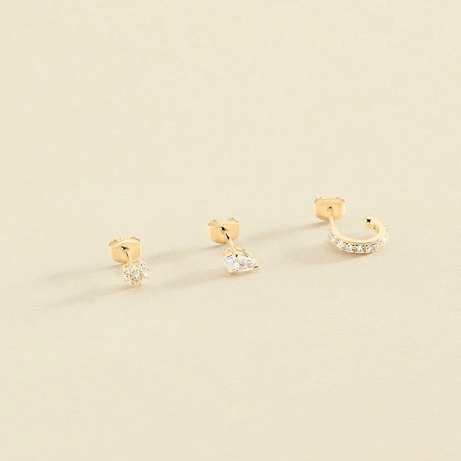 Set de 3 boucles d’oreilles, une crolee t une fleur pavées d’oxydes de zirconium et un oxyde de zirconium de forme navette, en argent doré 750/1000. A l’unité pour mieux les mixer et les accumuler.