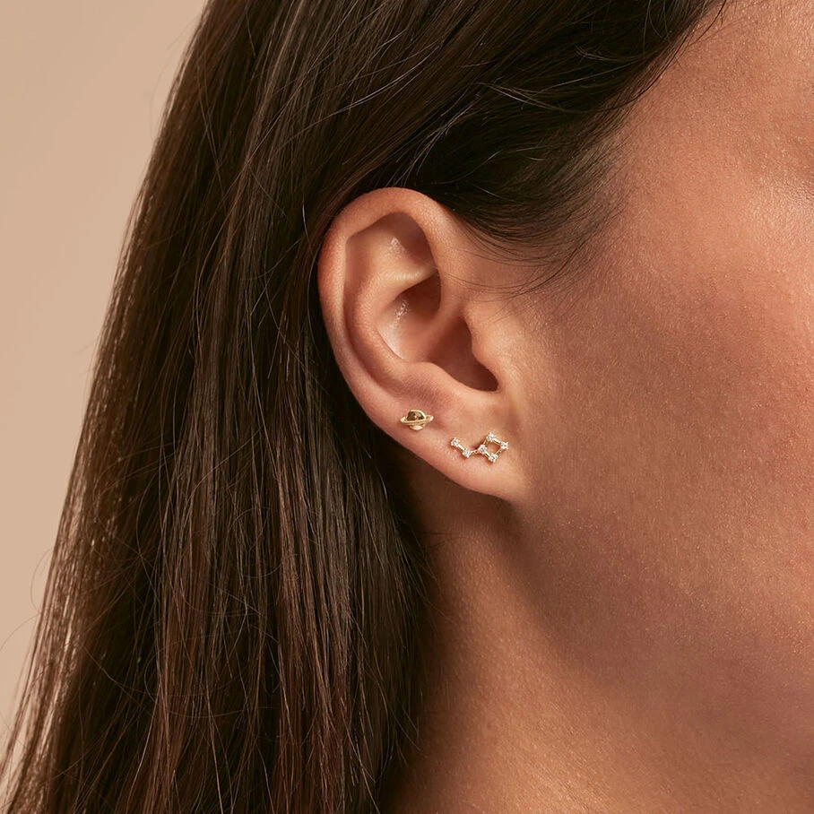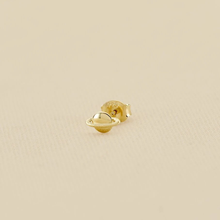 Boucle d’oreille puce, en argent doré 750/1000, planète saturne. A l’unité pour mieux les mixer et les accumuler.